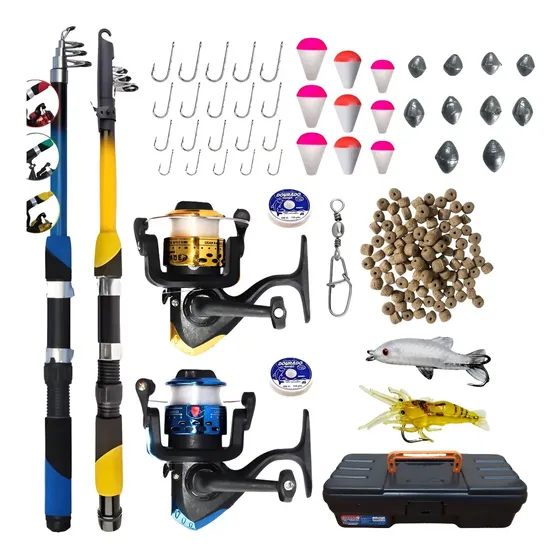 Pescamping Kit Pesca Completo 2 Varas Telescópica Fibra De Vidro E 2 Molinetes Leve Com Linha - Com Acessórios Bóias Chumbadas Anzóis Isca E Mais Tralha Quite De Pescaria